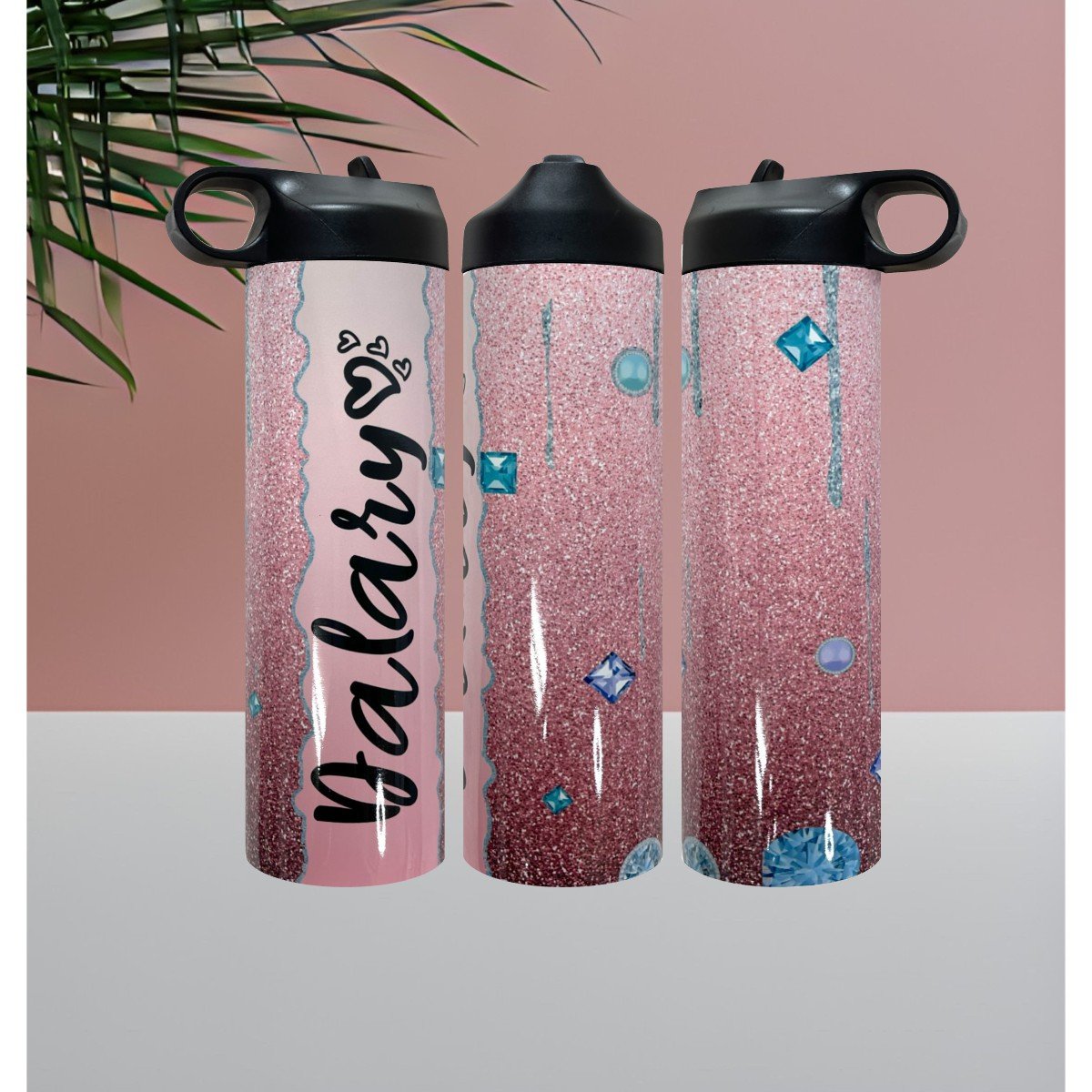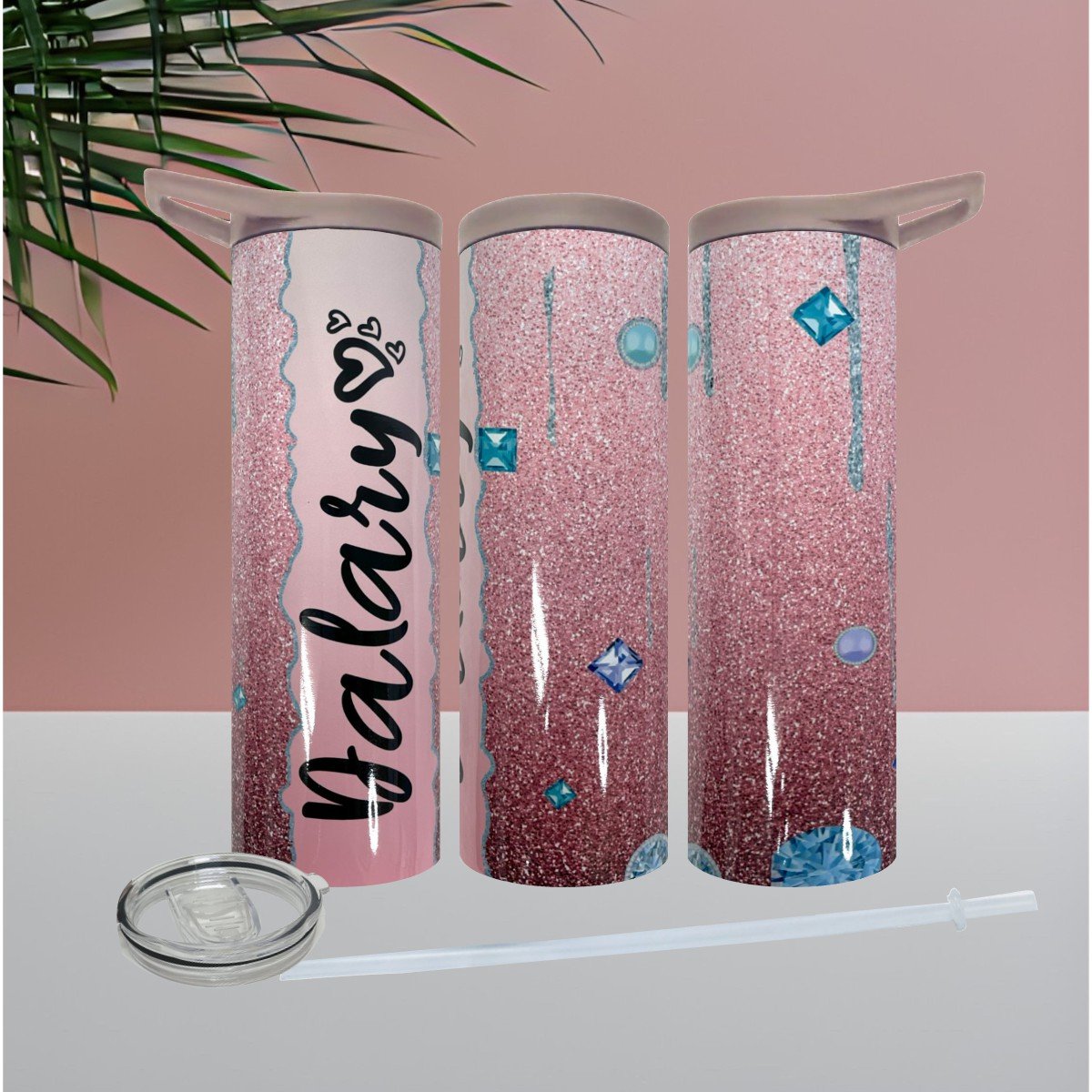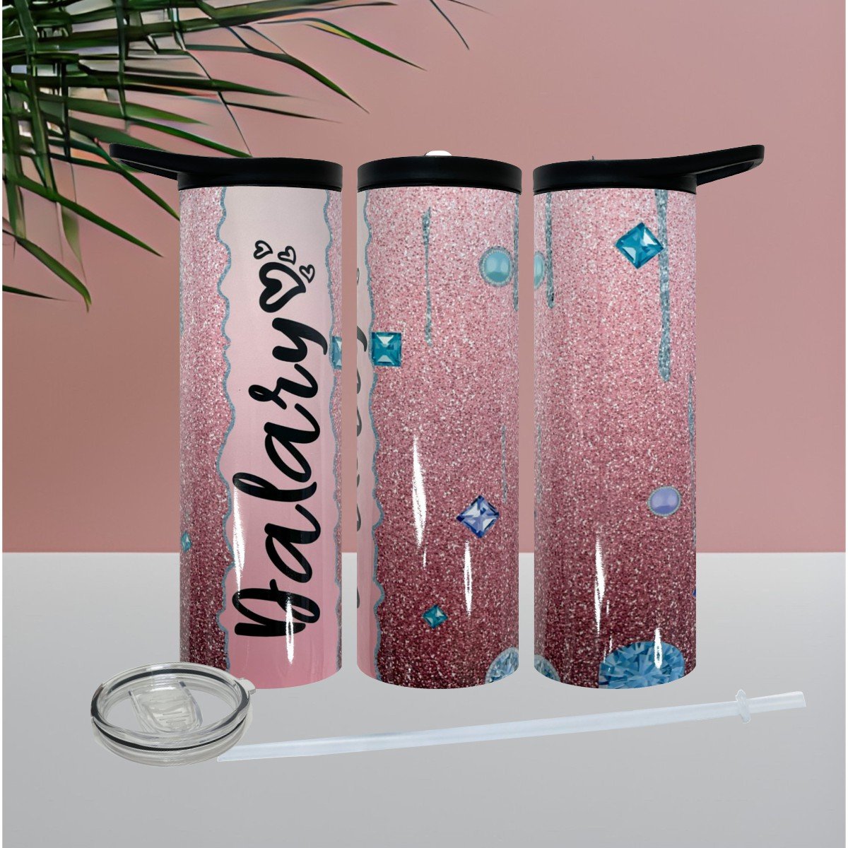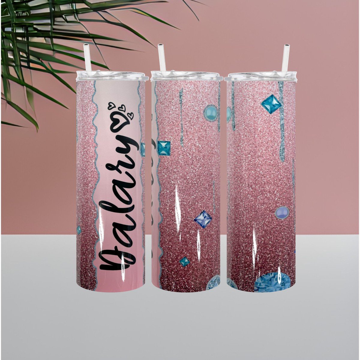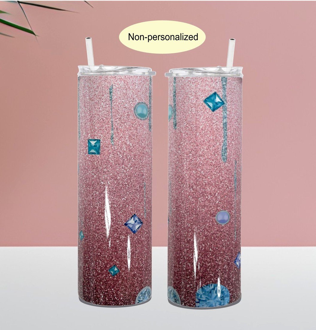 Gradient glitter and gems skillfully crafted using sublimation print method on a double wall insulated stainless straight tumbler with a glossy finish.