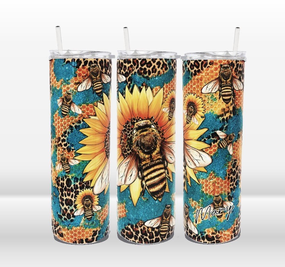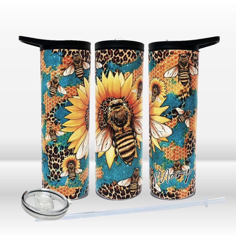 A vibrant blend of honey bees and sunflowers set against an abstract mix of leopard print, glitter accents, and honey-inspired patterns – this tumbler is the perfect blend of rustic charm and modern style.