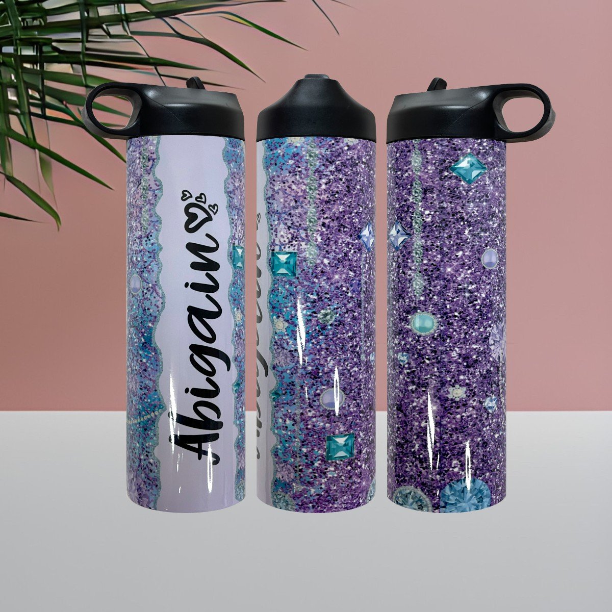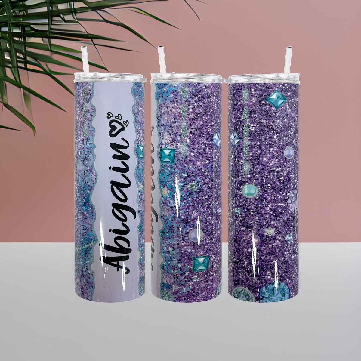 Purple glitter and gems skillfully crafted using sublimation print method on a double wall insulated stainless straight tumbler with a glossy finish.