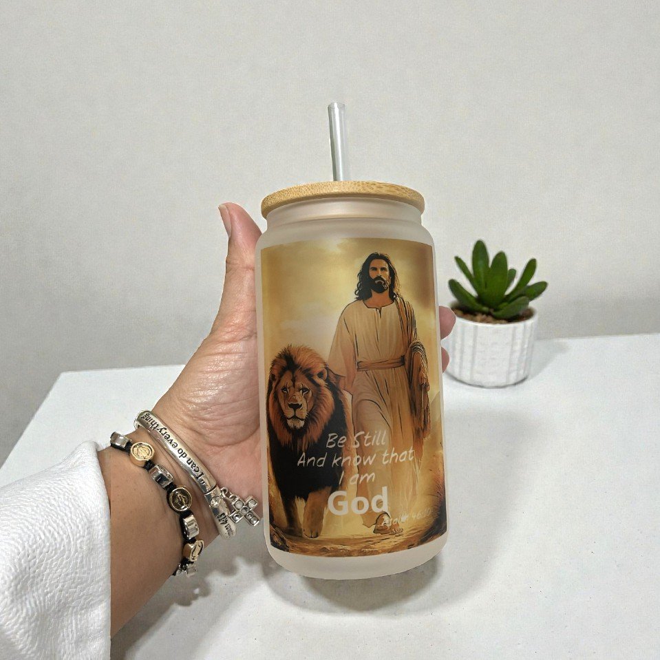 Sip with faith and inspiration using this beautifully designed 16oz frosted glass can tumbler. Featuring a serene illustration of Lion of Judah – Jesus walking alongside a lion, paired with the powerful scripture “Be still and know that I am God” (Psalm 46:10), this tumbler serves as a daily reminder of strength, peace, and trust in God.