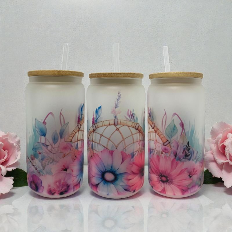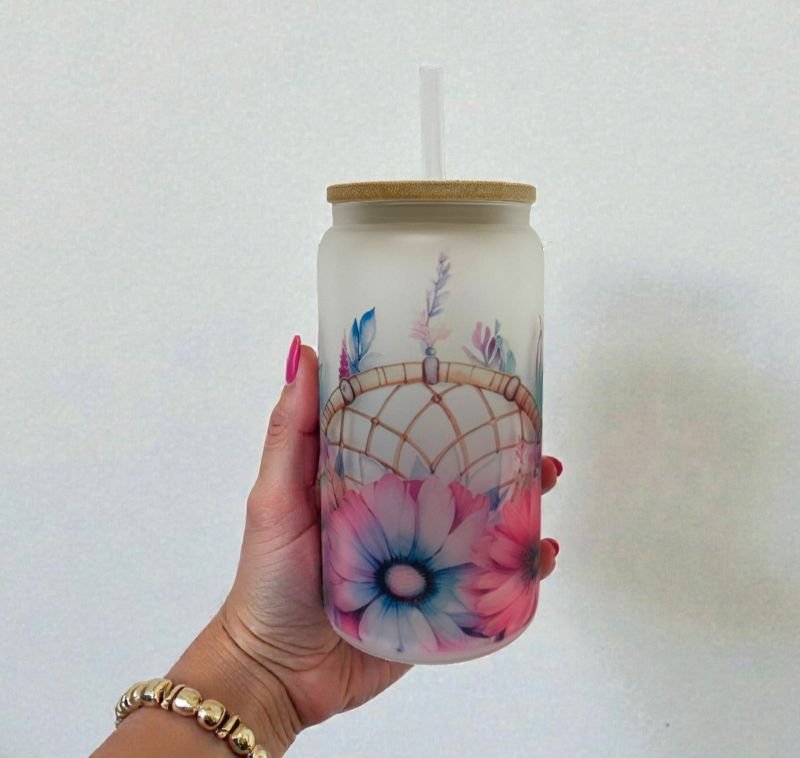 Add a touch of boho charm to your daily drinks with this stunning 16oz frosted glass can tumbler. Featuring a delicate dreamcatcher design surrounded by pastel florals in shades of pink, purple, and blue, this tumbler brings a calm, whimsical aesthetic that’s both stylish and soothing.